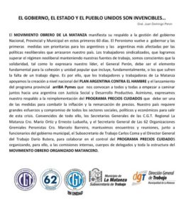 Comunicado de las 62 organizaciones peronistas de La Matanza por la situación en Venezuela
