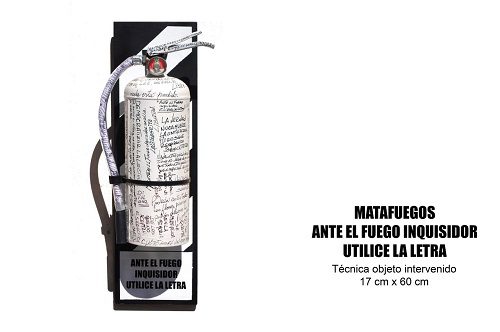 — Exactamente. Hay una obra que me gustaría le presten atención: se llama MATAFUEGO y es cuando en la dictadura cívico-militar fue incendiada la EDITORIAL DE AMÉRICA LATINA en Avellaneda. Había libros prohibidos y listas negras. Fue uno de los tantos hechos dolorosos que tuvimos en la Argentina. Quise retratar ese hecho, por eso tomé un matafuego y lo empecé a intervenir. ¿Y cómo lo intervine? Escribiendo textos de esos libros quemados…