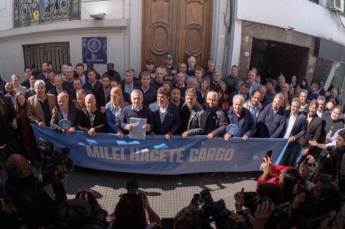 “Venimos al Ministerio de Capital Humano, la ministra Pettovello no está. Nadie nos quiere recibir el documento firmado por todos los intendentes de distintos partidos políticos de la provincia: radicales, vecinalistas, justicialistas”, continuó Fernando Espinoza y agregó: “Esto no es democracia. La gente no puede más. Milei, el año pasado le dio 90 mil millones de pesos a su amigo (Marcos) Galperín de Mercado Libre en exenciones fiscales, hoy estamos pidiendo acá los 80 mil millones que faltan para los alimentos de las niñas y niños bonaerenses en sus escuelas”.