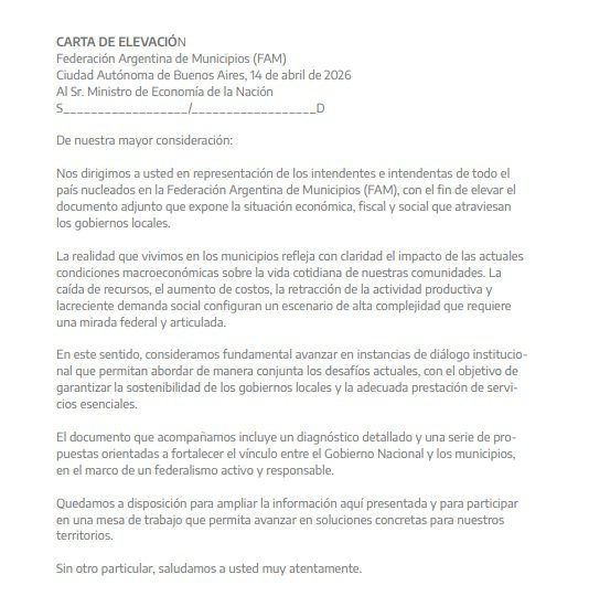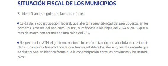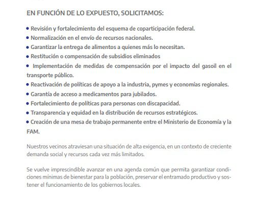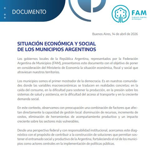 “La realidad que vivimos en los municipios refleja con claridad el impacto de las actuales condiciones macroeconómicas sobre la vida cotidiana de nuestras comunidades*. La caída de recursos, el aumento de costos, la retracción de la actividad productiva y la creciente demanda social configuran un escenario de alta complejidad que requiera una mirada federal y articulada”, expresaron desde la Federación Argentina de Municipios.