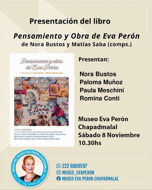Este Sábado 8 de Noviembre a las 10.30 horas se realizará la presentación del libro «Pensamiento y Obra de Eva Perón», la misma se realizará en el Museo Eva Perón de Chapadmalal.