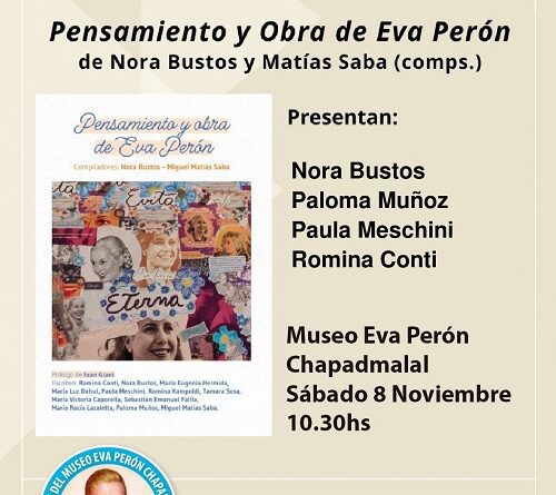 Este Sábado 8 de Noviembre a las 10.30 horas se realizará la presentación del libro «Pensamiento y Obra de Eva Perón», la misma se realizará en el Museo Eva Perón de Chapadmalal.
