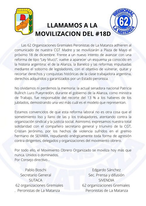 GremialesLocalesNacionalesProvincialesRegionalesSociedad Llamado a la Movilización el 18 de Diciembre 16 de diciembre de 2025 Veces visto: 14